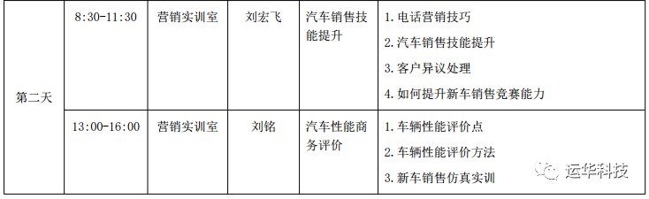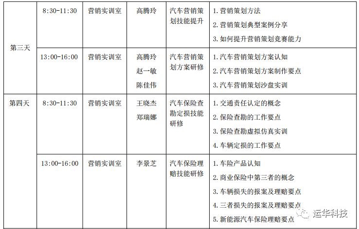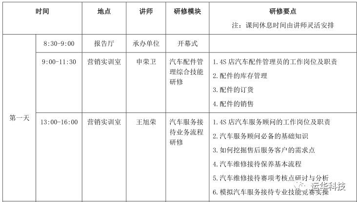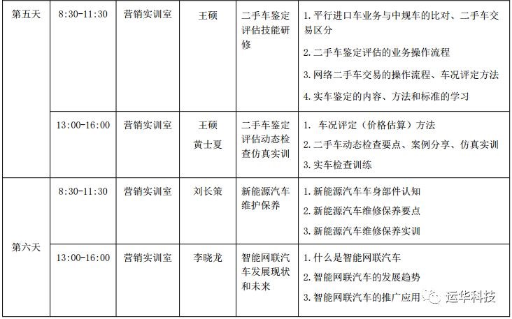 研修内容包括:汽车配件管理综合技能研修、汽车服务接待业务流程研修、汽车销售技能提升、汽车性能商务评价、汽车营销策划技能提升、汽车营销策划方案研修、汽车保险查勘定损技能研修、汽车保险理赔技能研修、二手车鉴定评估技能研修、二手车鉴定评估动态检查仿真实训、智能网联汽车发展现状与未来、理实一体化教学方法等。