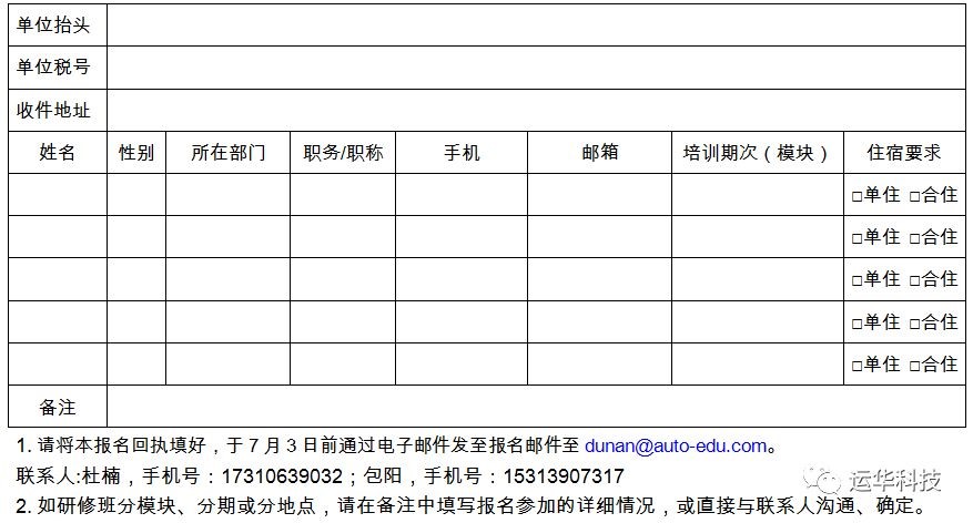 本次研修班招生100人,每个学校限报2名教师,特殊情况不超过3名,请有意参加研修者,认真填写《机械职业院校“汽车营销专业教师能力素质提升”研修班报名回执表》(见附件3),于2018年7月10日前,以电子邮件方式或传真反馈至以下联系方式。
