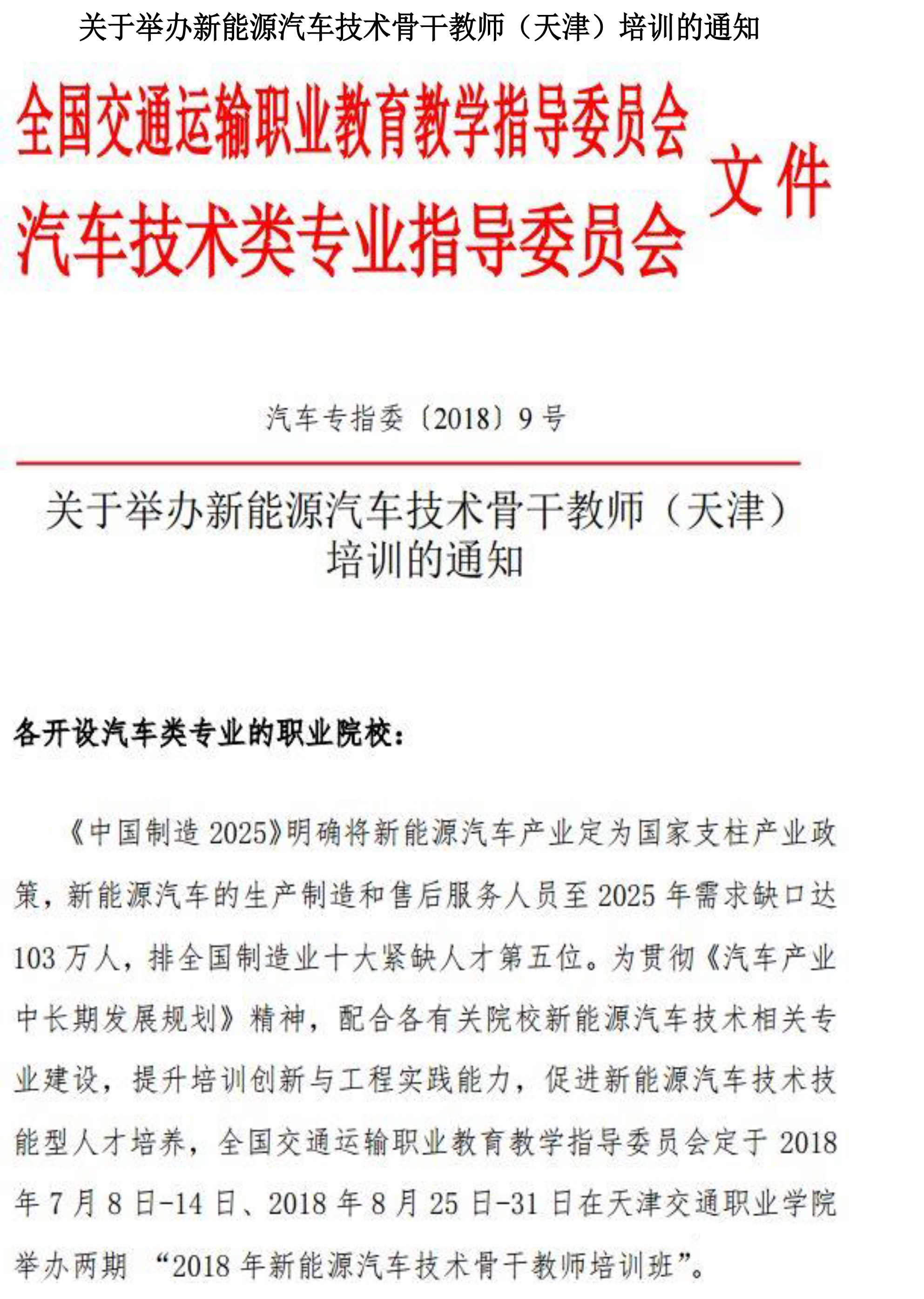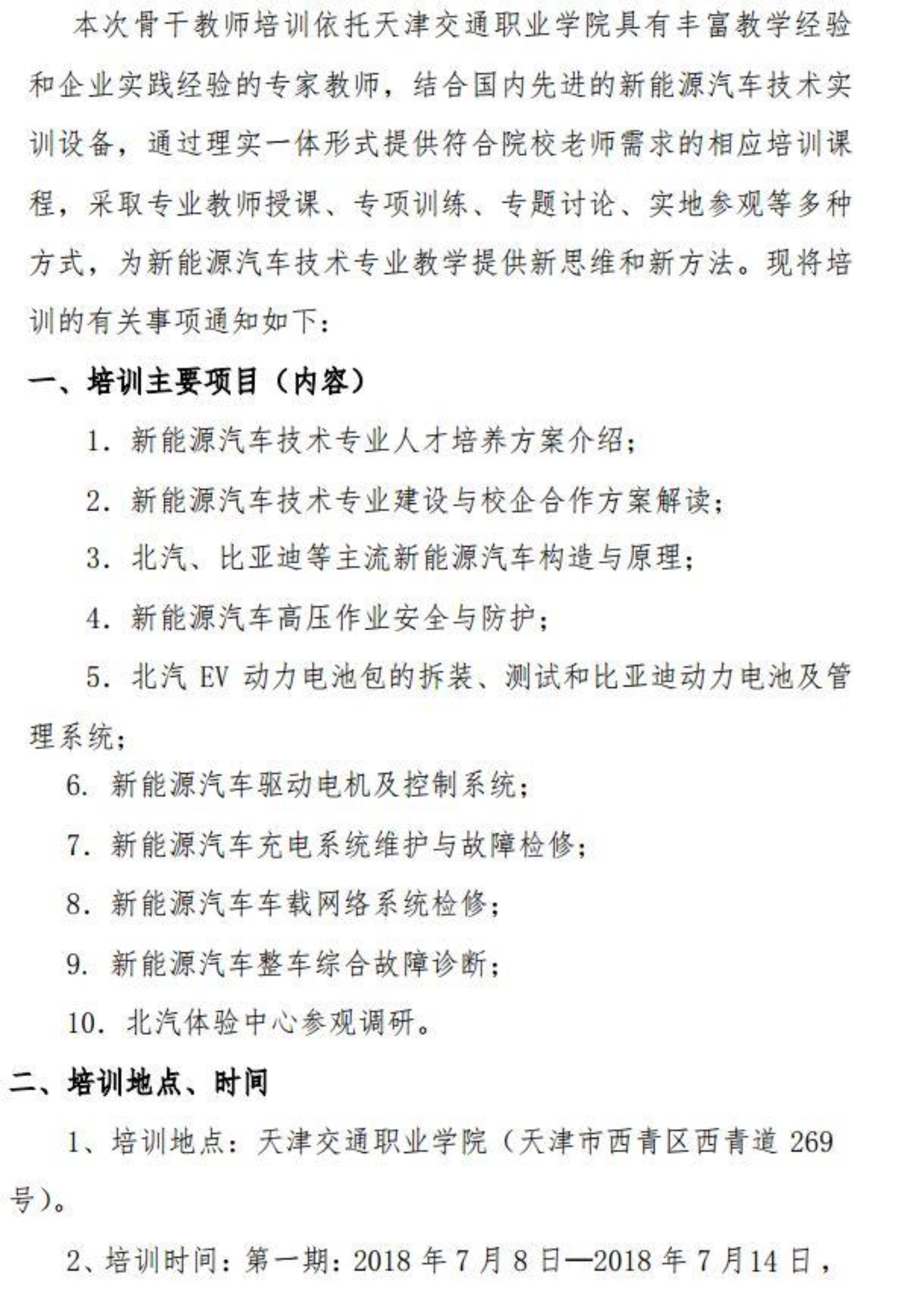 关于举办新能源汽车技术骨干教师(天津)培训的通知